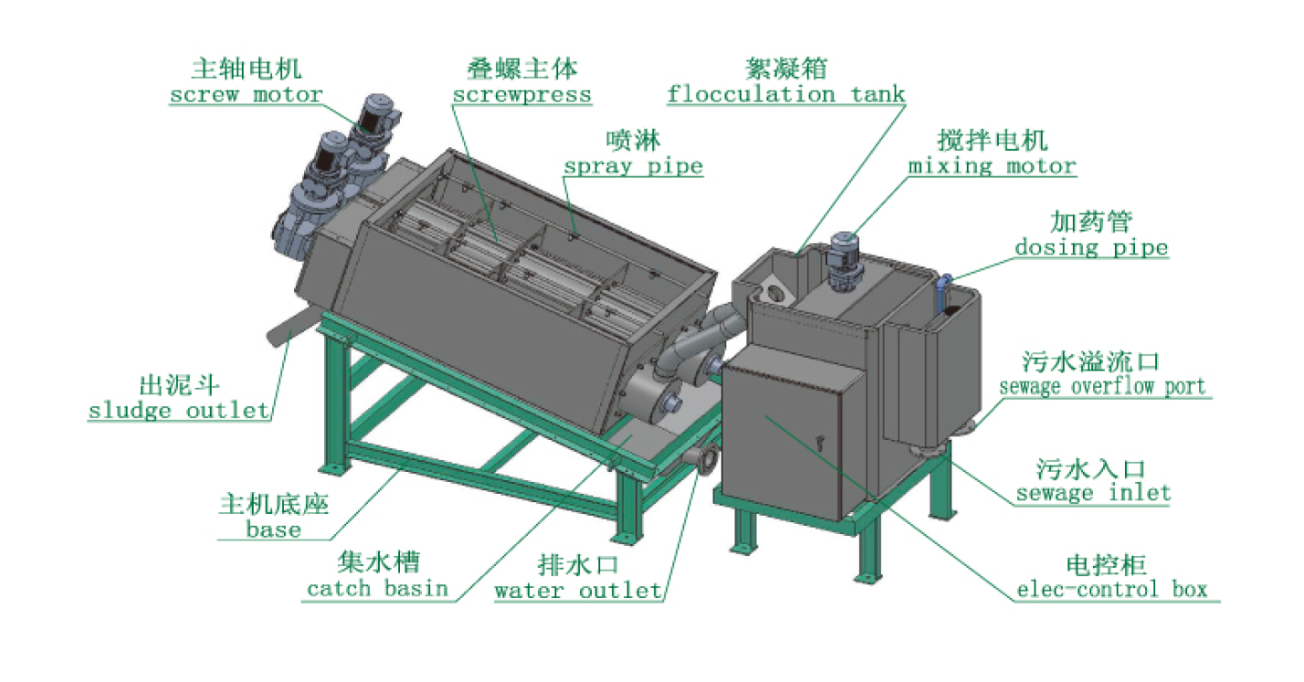 混合系統(tǒng)主要用于將污泥與藥劑進行充分混合,以形成礬花進行入到疊螺主體進行壓榨脫水。